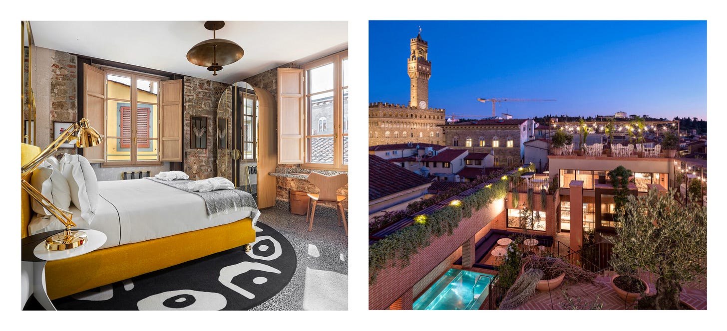 On reste en Italie avec l'hôtel Calimala à Florence. Installé dans le Palazzo degli Angeli (Palais des anges), cet hôtel 4 étoiles a été rénové par le designer Alex Meitlis dans un style mêlant modernité et matériaux traditionnels. Situé en plein cœur de Florence, c’est le lieu idéal pour se remettre dans le présent après une journée de visites.